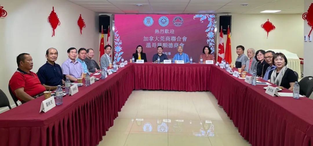 加拿大莞商联合会由常务副会长兼秘书长陈桥生带领,随行的有袁焯威副会长,刘文章副会长,林鐸培常務理事,莫耀根常务理事,袁沛林名誉顾问,李婉茹秘书等七人;温哥华顺德商会由常务副会长尤子明带领,随行的有黄展斌名誉顾问,周凤姬秘书等三人。BC省贸易省务厅长周炯华受三会领导邀请出席座谈会。我方出席接待的三会领导有加拿大粤商总会常务副会长,加拿大潮商会执行会长, 加拿大广东社团总会常务副会长兼秘书长庄晓爚;加拿大广东社团总会执行会长马威廉; 加拿大潮商会副会长兼秘书长, 加拿大粤商总会副会长林丽珊, 加拿大广东社团总会谈慧光副秘书长及徐燕屏副秘书长和秘书处全体成员。