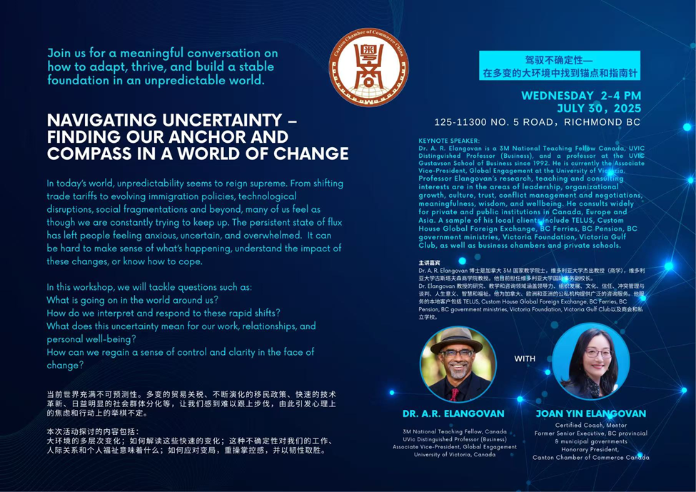 7月30日下午,在加拿大粵商總會辦公樓舉辦了一場精彩紛呈的專題演講——「駕馭不確定性:在多變的大環境中找到錨點與指南針」。