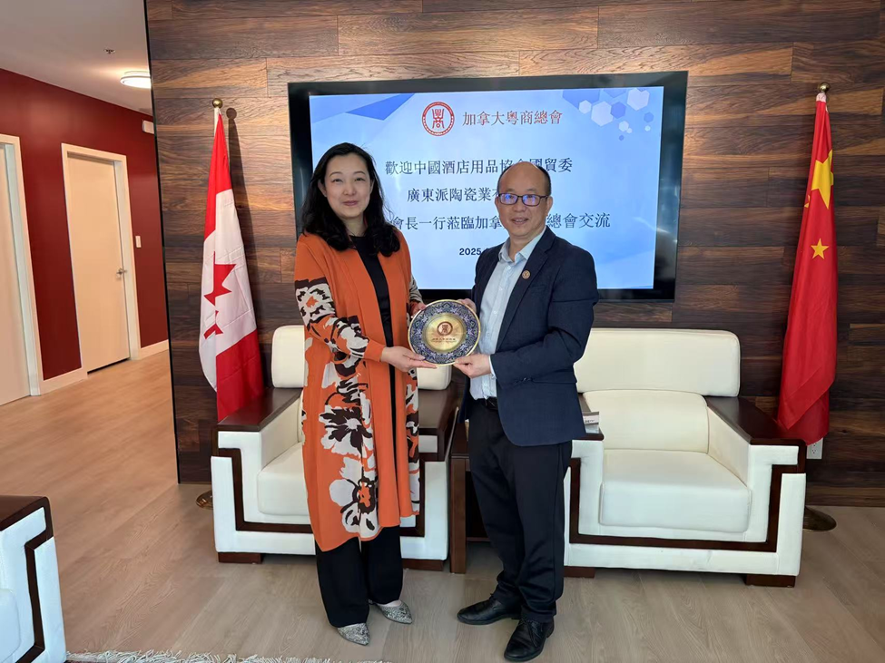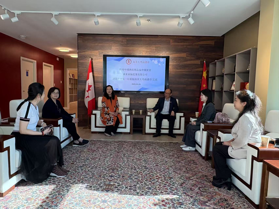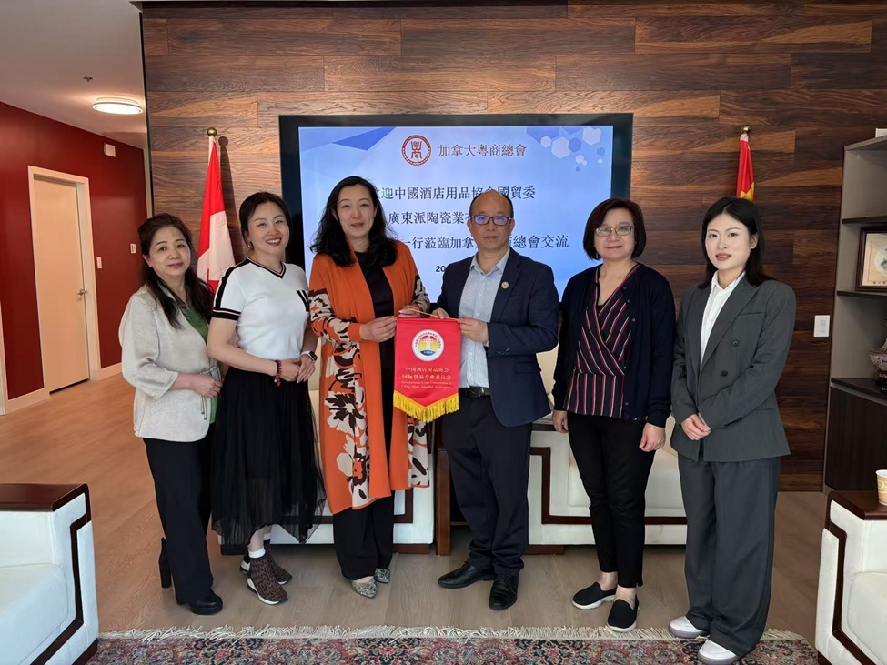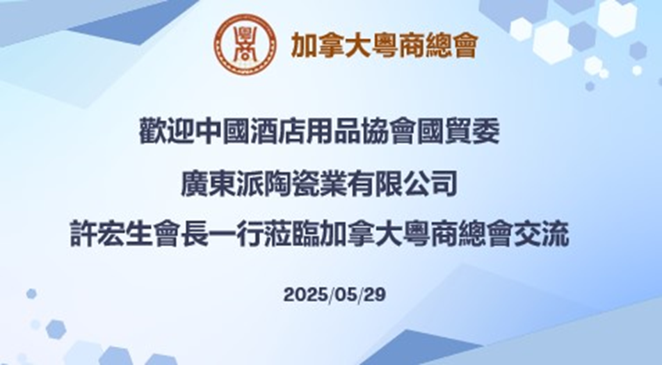2025年5月29日,中國酒店用品協會國貿委及廣東派陶瓷業有限公司許宏生會長和廣東派陶PITO海外事業部負責人盧津一行蒞臨加拿大粵商總會進行友好交流。此次交流會在加拿大粵商總會辦公樓舉行。加拿大粵商總會執行會長莊曉爚熱情接待了許宏生會長一行,商會會員單位代表Angela和吳虹儀及廣東省駐加拿大(溫哥華)經貿代表處首席代表林艷秋也出席了交流會。