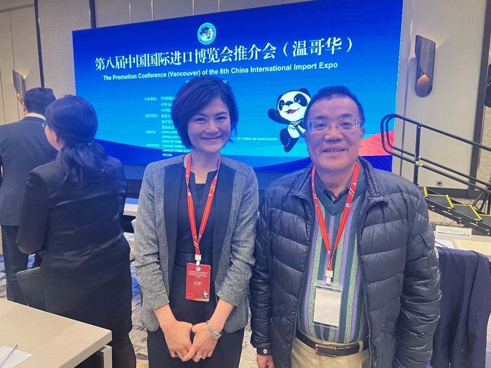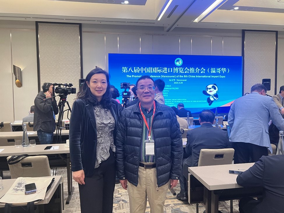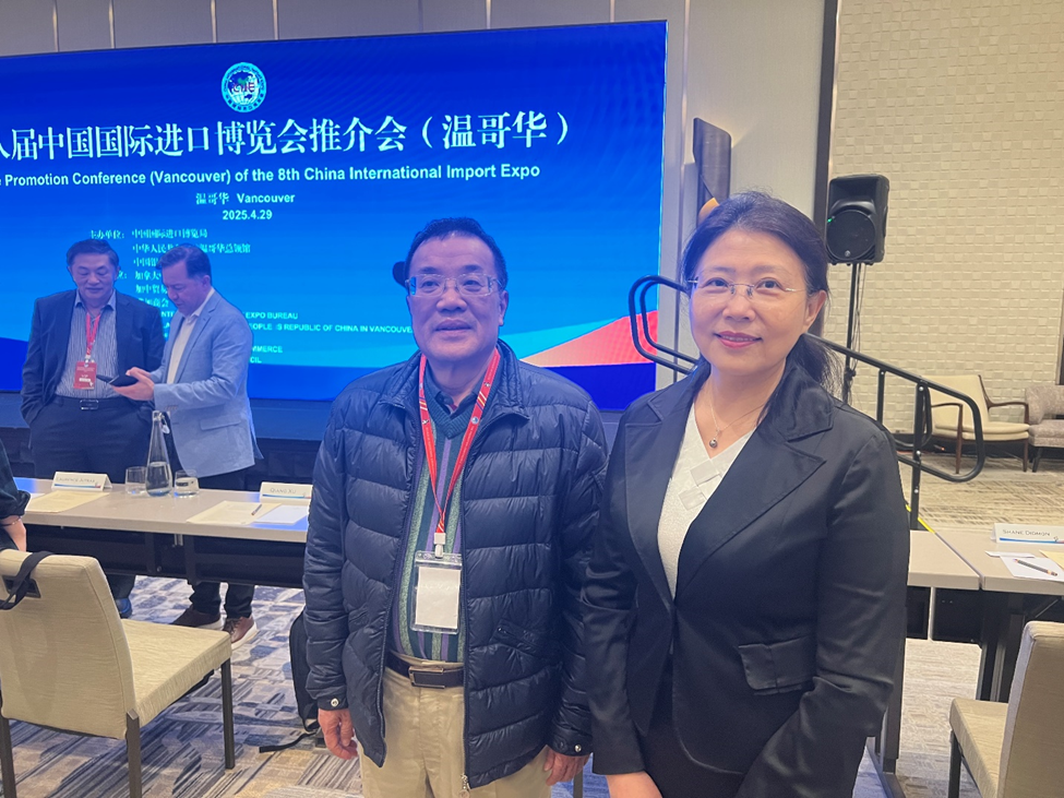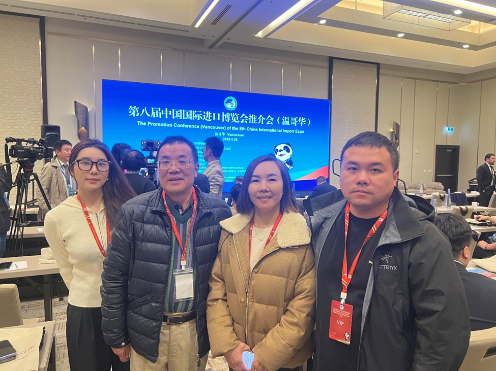 2025年4月29日,由中國國際進口博覽局、中國駐溫哥華總領事館和加拿大中國銀行聯合主辦的的第八屆中國國際進口博覽會推介會順利在溫哥華舉行,吸引當地工商界、學界和政府機構等250餘位代表參加。加拿大粵商總會對此次活動給予大力支持,共同會長韋雄、執行會長莊曉爚及部分會員出席了本次推介會。