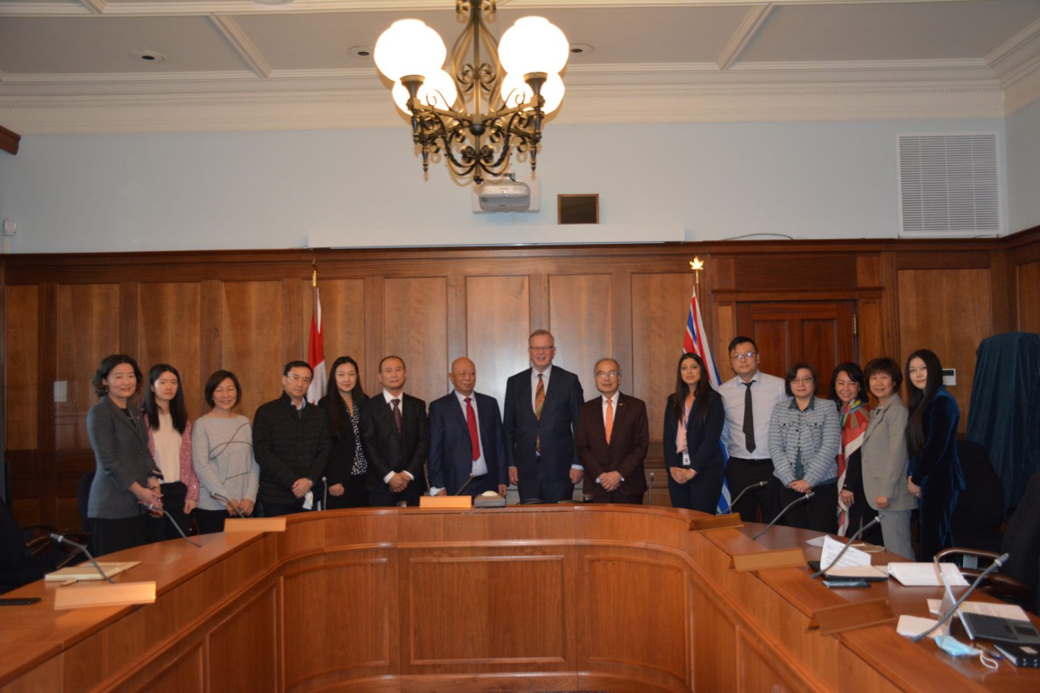 11月22日,加拿大粤商总会代表团在林少毅会长、陈育昭理事长的带领下,前往维多利亚省议会大厦,拜访卑诗省就业经济复苏与创新厅,受到贸易省务厅周炯华厅长、卑诗省能源矿产低碳创新厅厅长 Bruce Ralston, 贸易行业发展部副厅长Selena Basi等热情接待。